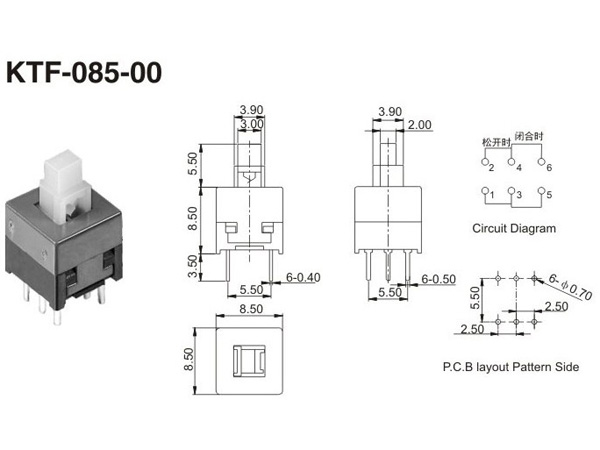 无锁开关/自锁开关KTF-085-00.产品广泛用于收音机、玩具、电话、电视机、MP3、等电脑通讯器材、及家用电器等设备。