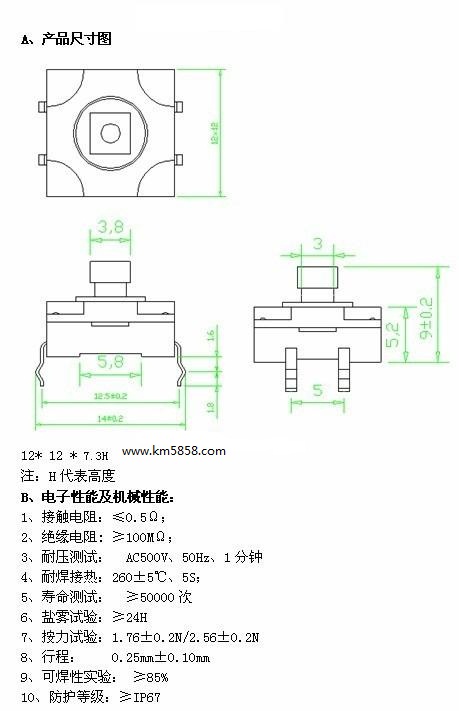 详细介绍: 防水轻触开关KM1212插脚 本产品广泛用于,玩具,电动玩具,玩具公仔,防盗器,家用电器,手机数码,电子通讯,电子游戏机,汽车防盗,智能化系统,电视机、MP3、耳机,等电脑通讯器材